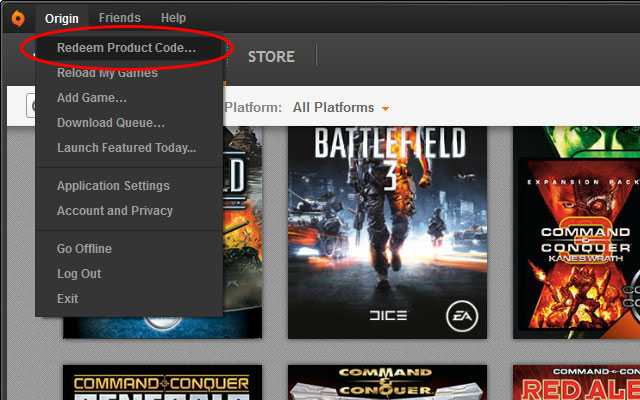 - เปิดเมนู “Origin” ด้านบนและเลือก “Redeem Product Code…” แล้วกรอก code ต่อไปนี้ลงไปในช่อง Product Code